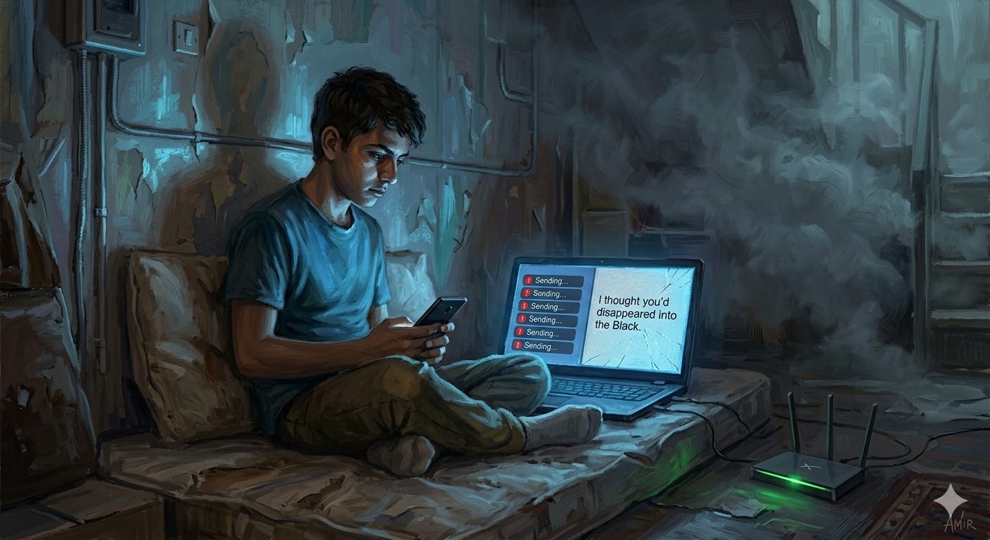 He opened WhatsApp first. Layla’s last message was from three weeks ago: “Are you safe? Call when you can.” He typed back: “I’m okay. Internet came back a little. Love you.” Sent.