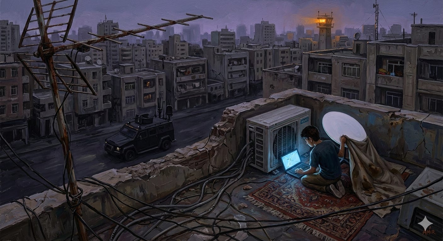 Amir’s was hidden on the roof under a tarp, pointed vaguely skyward. He’d tried it once. Got a few minutes of connection before the signal dropped like a rock. Jamming, everyone said. Regime trucks with antennas driving around neighborhoods, frying the GPS and RF. 80% packet loss.