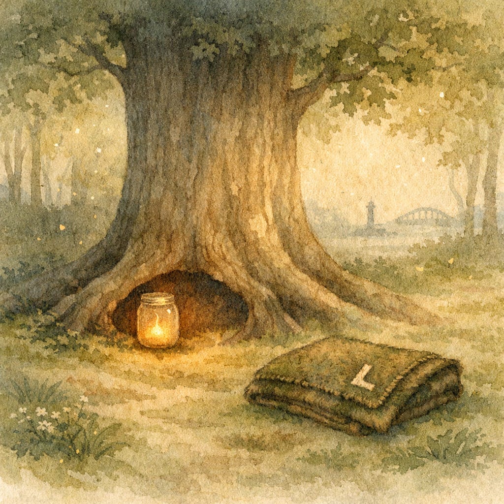 Its trunk was broad and steady, bark ridged with grooves her fingers traced without thinking. A small wooden shelf grew naturally from its side. It held the jar.